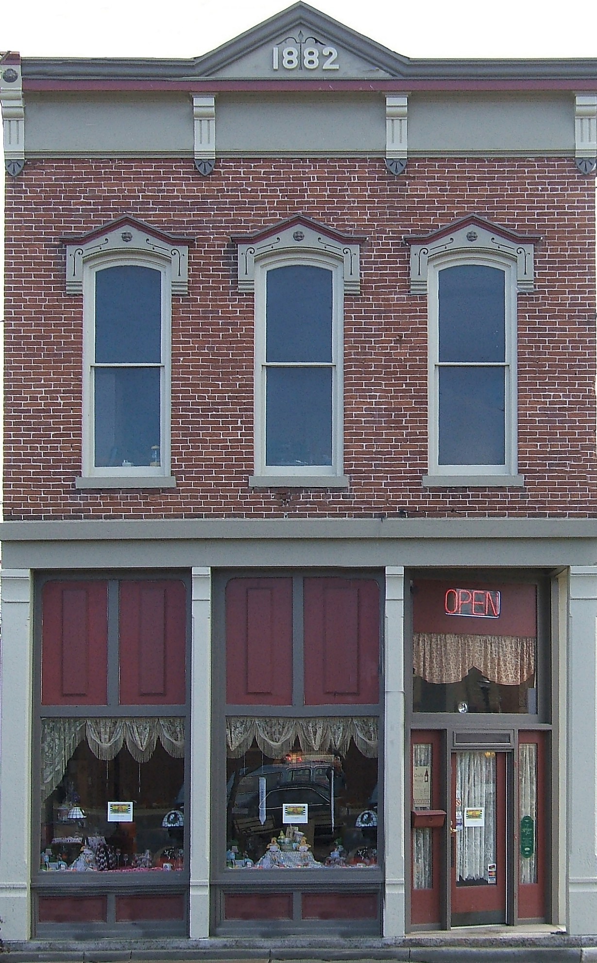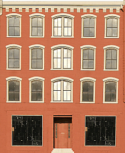 O and S-Scale BuildingsThree-Story Red Building (956K) This building and the next one stand next to each other on south Main Street in Dayton, Ohio (just north of route 35). I liked them because they represent the classic "storefront" buildings that dominated many American "downtown" districts between 1850 and 1920. The shape of the window trim on this one is unique, too. In addition, I could get a fairly "dead-on" shot by dodging the panhandlers across the street near the McDonalds. Unfortunately, the first story was so shaded that it didn't stay in focus as well as the rest of the building, but that doesn't destroy the overall effect. On my computer, I "squared up" the shot and removed an anachronistic street lamp and countless phone lines. | ||