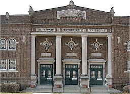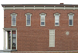 "Dillinger's" Store Front (692K ) - We have now left Dayton for the relatively quiet environs of New Carlisle, Ohio, another old community with some history. This former bank is on the corner of the busiest intersection in town. Interestsingly, it was once robbed by John Dillinger. After standing in line like any other customer, and chatting with the local folks, Dillinger told a farmer, "You picked a bad day to go to the bank," drew a firearm and went to the head of the line. In my first memory of the place, the downstairs of this building housed an old-fashioned ice cream parlor called "Dillingers." By the way, because this is a corner building, the door actually faces at a forty-five-degree angle to the right, straight toward the traffic light in the middle of the intersection.  Still, it doesn't look bad in the photo.    |   | |