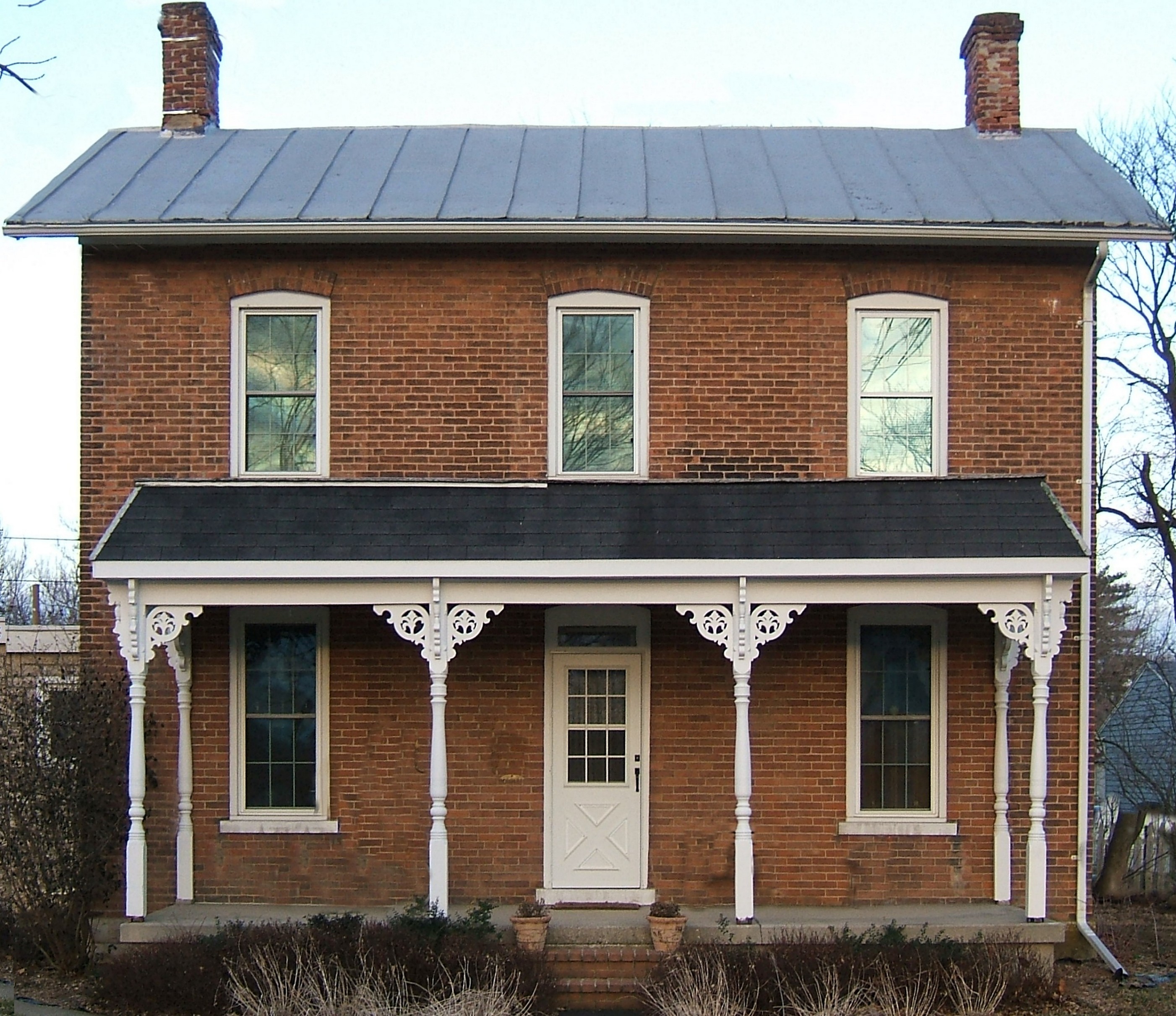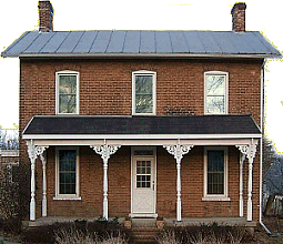 Medway Farm House (1.6 meg) - Southeast of New Carlisle on the banks of the Little Miami River (and sometimes under them) is the sleepy town of Medway, Ohio. I photographed this early nineteenth-century farmhouse because I liked its clean lines. I also cut out some foilage and a whole bunch of bicycles and benches and stuff on the front porch. (That process left some discoloration on the porch, but it allows you to put your own clutter there instead.) This photograph was taken in early morning, so the upper windows reflect the just-past-dawn eastern sky as seen through tree branches from the other side of the street. This photo would make an interesting study in faux-three dimensions.  You could print two copies, glue them both on foam board, then cut out the front row of porch posts along with the gingerbread and, the fachia with an Xacto knife, then and glue it over the "background" photo. You could paint a strip of foam board brownish-gray to use for the new front edge of the porch, or disguise the foilage in the photo with a shrubbery of your choice.  Of course, if you go this far, you could also consider replacing the tin roof with the old cedar shake roof from the  Building Textures page.   |  > | |