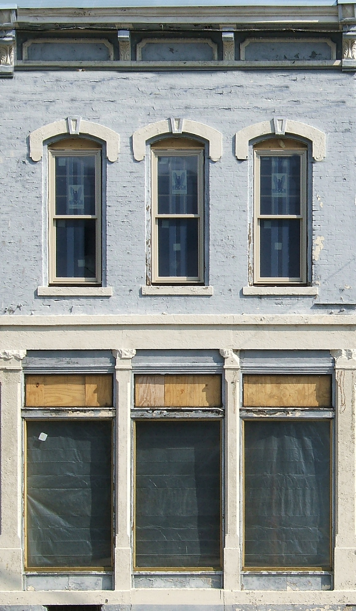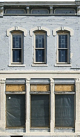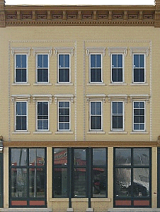Three-Story Yellow Building - (1.5meg) - This Dayton building is another painted brick edifice.  Again, I squared up the building and removed an anachronistic street lamp and many phone lines. However, in some cases the lines crossed details on the building that would be difficult to reconstruct if I edited them out altogether, so if you look closely at the the blowup you can still see them, although I doubt most people would notice. One wierd aspect of this building I just noticed when I was trying to calculate the scale of the building - this building actually doesn't have any doors facing the street.  I'm sure you can figure out how to get around that if you need to.  | ||