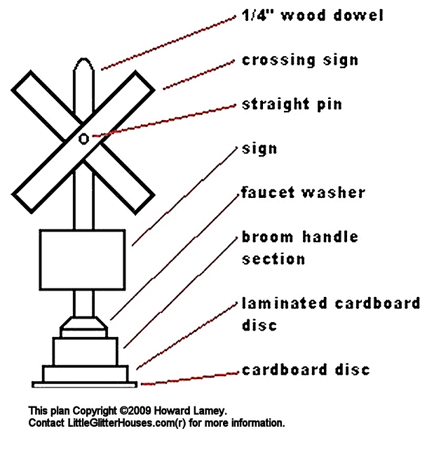 Note from Editor: In early 2009, Christmas Village project designer Howard Lamey and I began working together to bring the look of the very old tinplate trains and towns into modern-day homes. For this Tribute to Tinplate(tm) series, I've been providing graphics that were inspired by the tinplated-steel buildings and accessories of a century ago, and Howard's been providing the "how-to" hands-on instructions and detail plans for completing the project. Soon it became obvious that authentic period accessories would be necessary to cinch the overall look of the tinplate era. This "crossbuck" was inspired largely by a Marx accessory designed to work with Marx tinplate O gauge trains. Like most accessories made for those trains, this is a tad oversized, but that contributes to the authentic look. For your convenience, we have also provided the plans and graphics in smaller and larger scales. Betcha can't build one. (Just one, that is!)