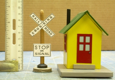 Very few tinplate trains were built in anything like a specific scale. Generally, trains were between 75% and 50% of the size they really "should have been" based on the width of the track they ran on. Ironically, many accessories were larger than they "should have been." We have chosen to scale this accessory so that it looks right with the Watchman's Shanty project and will look "right" with most O gauge/O27 trains. However, we have provided resources and guidelines for building this project in smaller and larger sizes.