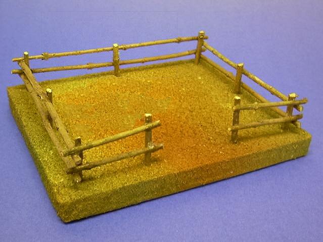 - Glue twig fence rails to posts. Clothes pins make good clamps. You can also tie rails to posts with dark color buttonhole thread and apply glue.