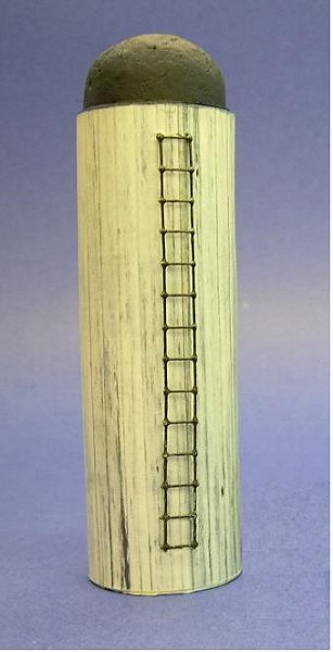 The silo roof shown was made from a piece of cork. Prime and paint the silo roof and glue it in place.