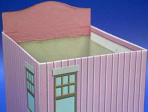 Because I didn't cut the crest's shape out, the building's crest looks a little funny at first. I could have cut it out ahead of time, I suppose, but then I'd have an extra variable while trying to align the graphic for the store front with the left and right edge. Or worse yet, I'd discover that I had cut the crest shape wrong and have to start a building all over again. Trimming the CrestWhen the glue for the front has dried completely (meaning overnight at least), use a very sharp Xacto-style knife to trim the crest to match the shape of the graphic. Don't rush this job or try to cut all the way through both layers of cardboard on the first pass. Instead, make many light passes.