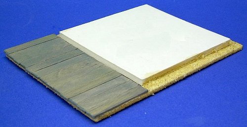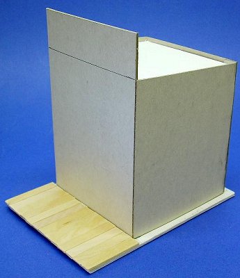 Building the BaseIt was my idea to make the "sidewalk" in front of the building into a "boardwalk." This will eventually give you a very nice place to set figures, fire hydrants, lamp posts, and the like.I made the base by laminating two pieces of the thin corrugated cardboard from Express Mail packages. You could laminate "matte" cardboard as well. The foundation should fit loosely inside the four sides of the building once it is assembled. Eventually, it will give you more surface for gluing the building down to the base reliably. That said, you don't want to glue the foundation to anything until the building is To create the boardwalk, I cut several popsicle sticks into two-inch lengths. Then I checked the fit of the building on the foundation. When I was sure of the fit, I glued the foundation and popsicle sticks down. I stained the popsicle sticks with watered down gray and driftwood color acrylic paint. I painted the base with tan (sand-colored) paint; then I glued on the popsicle sticks. Finally I glued sand over the part of the base that was still exposed. Work a little at a time, spreading white craft glue (like Elmer's), and tamping the sand into the glue. Building the Crest and SupportBy making three of these at the same time, I could work on one while the other one was drying, and so on. Let the building frames dry at least overnight before you start applying the graphics - the last thing you need is a joint popping or the frame getting wobbly while you're trying to be precise with the graphic. Applying the GraphicsThen I carefully applied the graphic wraps to one wall at a time. I started on the sides, then did the back and front. I could have started with the backs just as easily, but the front definitely has to come last.
