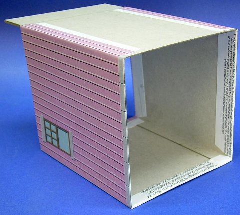 Applying the RoofOnce you have the structure glued together and all graphics applied, cut out a piece of corrugated cardboard or foam core to fit just inside the walls. Choose and apply a roofing pattern, and when it is completely dry, fasten it in place. I fastened mine about an 1/8" down from the side and back walls. I actually applied the glue from inside the building, then brushed it into the seams where the roof fit the walls.Touch Up the Cut LinesWhen all the graphics are applied, take a marker or fine-tipped brush and touch up the edges of the cut graphic media with a color that is compatible with the siding color.