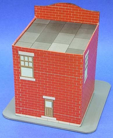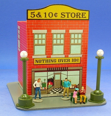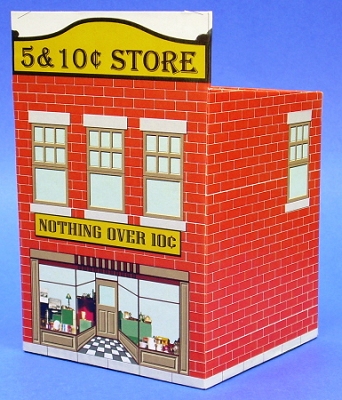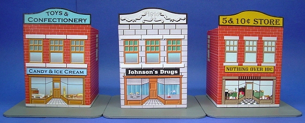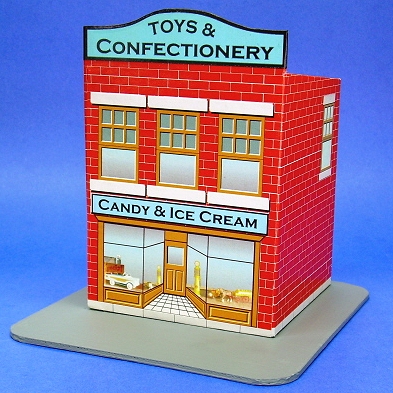 Like the For this project, we chose a series of candy containers that were made in the early-to-mid 1900s by West Brothers. Each container included a glass full of candy that you could see through the house's "windows." A photo of the candy tin that inspired the drug store project is at the left. Creating multiple "different" buildings by changing the graphics on the same basic structure was a favorite money-saving device of several tinplate toy manufacturers. The three buildings we have so far are inspired by specific tins for which we found photos. Of course, once I designed one of these, I just had to design a couple more. In the meantime, Howard kept trying out different ways to use the designs and sending me his feedback. The main reason we don't have four or five structures in this article is that we ran out of time. I have plans for at least two more storefronts that I hope to get to eventually. If you sign up for our Trains-N-Towns(tm) newsletter, we'll let you now when we create and upload more storefronts or other projects you might find helpful. Building TinPlate-Syle Store Fronts - from Big Indoor Trains(tm)After Paul and I started creating our first Tribute to Tinplate(tm)" buildings, we both started combing the Internet for photographs of worthwhile projects. The problem isn't lack of examples; it's that there are so many to chose from. After the Vine-Covered Cottage project, which turned out to be fairly complicated, Paul wanted to pick one that would be different than any we had done so far, simpler to build, and reusable just by changing the graphics. So the West Brothers' tin storefronts seemed like a good next project. That didn't keep me from giving him plenty of feedback, though. Still, when Paul sent the final graphic files and I printed them on a good color laser, I couldn't help getting excited about this project, and about how it would look with my tiny but growing O gauge Marx railroad.What You Will Need