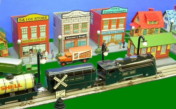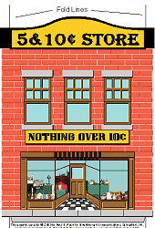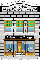 A Note about ScaleAlthough my Marx trains run on O gauge tracks, they are closer to S scale (1:64), the scale of S gauge American Flyer trains, and many collectible village houses. So I chose that scale to build these projects. If you're running larger equipment (like post-war Lionel, for example), you might consider the O scale version.What if You Need Something Bigger? - If you're running Large Scale (garden trains) or the old-fashioned Standard Gauge tinplate trains, you will need to contact Paul for the 1:37 version, the largest that these buildings can be printed out on most printers. Or you might be able to get a copy center to print the S-scale or O scale graphics at 2X on a large format printer (for 1:32 or 1:24 respectively) - the resolution of the graphics should be high enough to support that. But those files are just too big to host permanently unless folks start donating more toward Paul's Hard Disk Space fund. :-) If you want to be certain your project will look right with your existing equipment, consider doing a "mockup" first. Choose the scale you feel mostly likely to prefer, and print out a copy of Paul's graphics for that scale in black and white (saving your color cartridges). Then cut and fold the printout to make a mockup you can set next to your trains and other accessories before you begin the final structure. Print the PatternsThis project has a structure pattern that you will need to cut out and transfer to cardboard, as well as graphic sheets that you will use to finish the building's appearance. Again, doing a mock-up to make certain the finished structure will look right with your existing equipment is very important.Note: For this project, we have provided the patterns only in S scale, the scale we used for this project. Go ahead and print out the patterns, though, as they include the measurements for O scale. If you need additional measurements for an O-scale project, you can get them from Paul's graphics. Be sure to measure between the "fold lines" when you're measuring horizontally, though. You may print the structure pattern on any sort of paper, since you're simply using this to transfer the plan to your cardboard medium. However the "lithograph" graphic should be printed on acid-free heavy paper or card stock. Note that Plans 1a and 1b are meant to be spliced together before you transfer the pattern to the cardboard. For Optimum Printing - For the lithographic "wrap," we have used professional "vector" graphics when possible, to make certain that you get the highest resolution graphic, whatever scale you use. In most cases, you can get the best result by right-clicking on the name of the graphic you need, then saving the pdf file to your hard drive. (That way if you accidentally print them at the wrong size, which is very easy to do on some printers, you don't have to download them again.) Then navigate to the folder where you saved the files and click on the file name. Adobe Acrobat Reader should open up. Make certain that the graphic is set to print at 100% ("scale to fit" or "fit to page" should not be checked). Structure PatternsStore Fronts