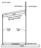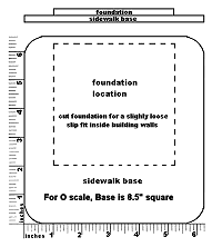 Building the BaseIt was Paul's idea for the base to represent a sidewalk/curb around the building. It will eventually give you a very nice place to set figures, fire hydrants, lamp posts, and the like. To provide room for such accessories, it extends one inch out to each side and two inches out front.I made the base by laminating two pieces of the thin corrugated cardboard from Express Mail packages. You could laminate "matte" cardboard as well. The foundation should fit loosely inside the four sides of the building once it is assembled. Eventually, it will give you more surface for gluing the building down to the base reliably. That said, you don't want to glue the foundation to anything until the building is complete and you have checked the fit one last time. To finish the base, I used gray paint to represent sidewalk. Because I had used corrugated cardboard, I was careful to dab paint into the edges to fill in the gaps. I probably could have used vinyl spackling do accomplish the same thing. If you wish, you can draw thin black lines on the base in a grid pattern to represent the sidewalk pattern; I've done that on other structures but I haven't done it on these yet. Building the Crest and SupportBy making three of these at the same time, I could work on one while the other one was drying, and so on. Let the building frames dry at least overnight before you start applying the graphics - the last thing you need is a joint popping or the frame getting wobbly while you're trying to be precise with the graphic. Applying the GraphicsThen I carefully applied the graphic wraps to one wall at a time. I started on the sides, then did the back and front. I could have started with the backs just as easily, but the front definitely has to come last. At my insistence, each of Paul's graphics includes a little bit of extra material at the edges to take up any "slack" in case your measurements are an eighth of an inch off or something. Before you cut off the fold lines, hold the wrap up to the wall it is going onto and see how close the fold lines are to the actual corners. If they're close, fold the first wrap (a back or side) along one fold line, then hold it against the wall you will be using it on. Then, if it is necessary, you can adjust the other fold. When you're certain your fold lines are where they need to be, crease them sharply and cut the white parts off of the graphic. Spread a thin layer of glue over the entire wall to be glued, and along the edges where the extra bits will wrap around the corner. Then fasten the graphic down carefully. Consider using clothespins or the like to make certain the wrap doesn't shift during the drying process. Once the first "wall" has dried, you add the next wall, except that one of your "fold lines" on the next wall should actually be a "cut line" if your graphic pages are fitting where they need to be. Remember you may also be trying to align mortar lines at the same time, so take your time.