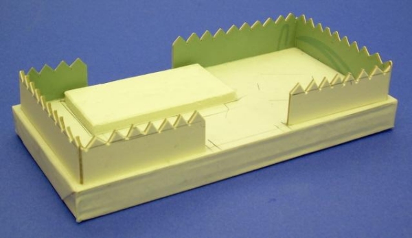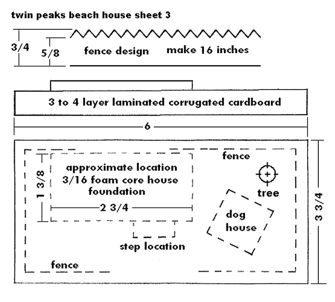 If neither of those work, contact Paul and ask him for help - that's his department. :-) Building the BaseThe base is a rectangular "box" that is decorated before the house and doghouse are installed. For this project, it should be about 6" long, 3 3/4" wide, and about 1/2" high.Note: For this project, I cut the base and fence pieces out at the same time. The fence pieces are made from thick card stock such as the back of a writing tablet. If you wish, you may use different materials for the fence, including miniature wooden picket or snow fence from the craft store or a rustic rail fence you make from twigs. Cut And Glue The Base - Usually the best method is to make a base from layers of corrugated cardboard glued together in a sandwich. You then wrap and glue a strip of thin poster-board or cereal-box cardboard all around it to camouflage the rough edges of the corrugated cardboard.