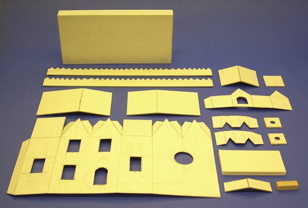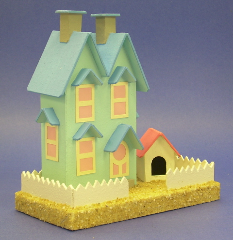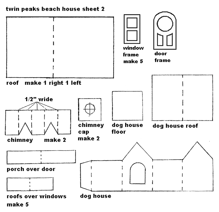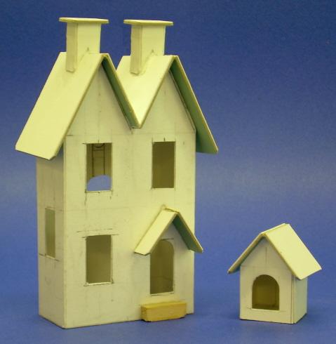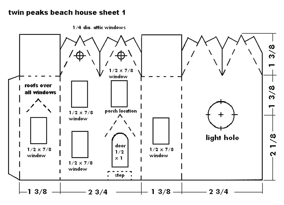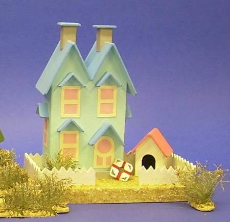 Note from Editor: Howard Lamey, in Jacksonville, Florida, has retired from a full-time job in advertising that included designing window displays for a major retailer. Now he has turned those artistic talents to designing and building vintage-style cardboard buildings for his family and friends. Howard now has his own site, LittleGlitterHouses.com, but he continues to graciously share his craft knowledge with our readers. Building the Twin Peaks Beach HouseThis project is a followup to our Sandy ShoresTM Lighthouse project that was published in January, 2009. We have finished this house in "seaside" colors that are typical of seaside houses in many parts of the United States. If you like the shape, of course, you are certainly welcome to use other colors and refinish it for a Halloween or Christmas village. If you do make one, please send us photos, that's our best reward for providing these projects.What You Will NeedFirst of all, you need cardboard, such as that from cereal boxes, the backs of writing tablets, anything flat, firm and clean, that you can save. Please keep some corrogated cardboard on hand, too - it makes the best bases.In addition, for this project you'll need: